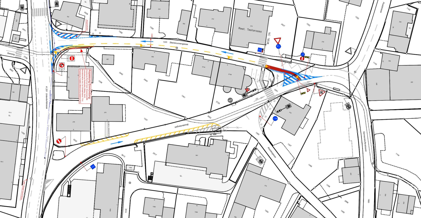 Einführung eines Einbahnsystems mit der Randbedingung, die Einmündungenso zu projektieren, dass die Befahrbarkeit für Gelenkbusse gegeben ist und die Sichtverhältnisse bei der Einmündung Steinbrunnengasse in die K251 im Rahmen der örtlichen Möglichkeiten optimiert werden.
